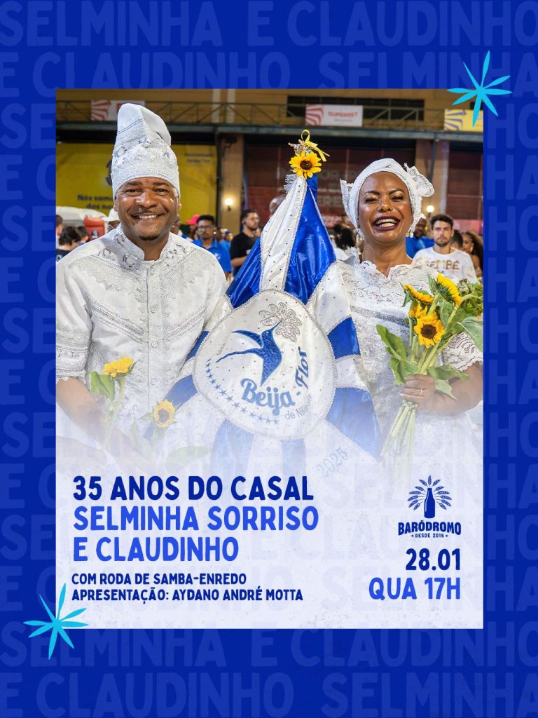 O primeiro casal de mestre-sala e porta-bandeira, Selminha Sorriso e Claudinho, completam 35 anos de parceria neste ano de 2026 e celebrarão a data em uma festa no Baródromo.